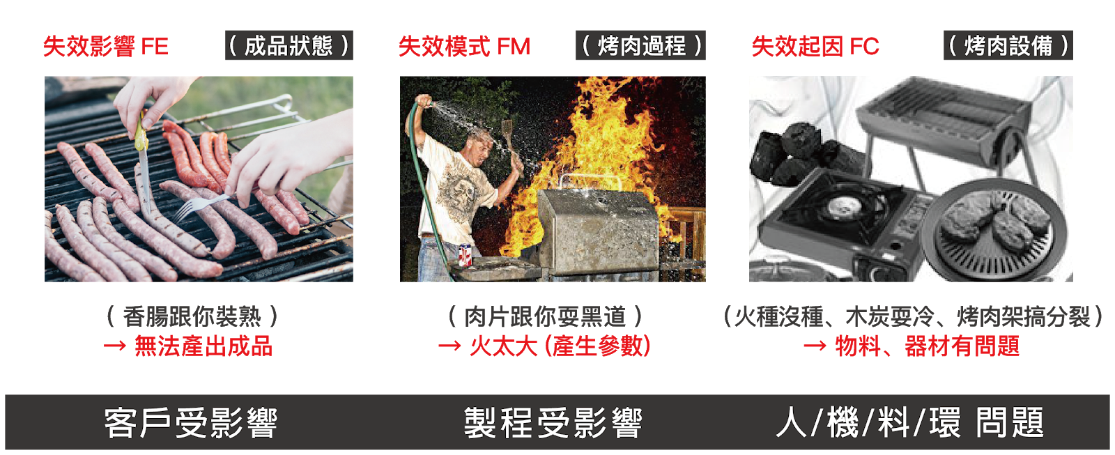 • 失效模式(FM):肉烤焦了 → 生產過程出現問題(製程受影響)